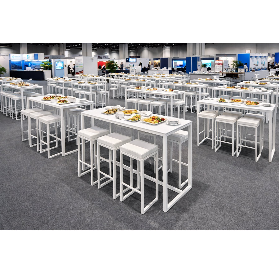 Passende Bars und Tresen, beleuchtete Möbel und Accessoires wie Pflanzen und Stehlampen, Raumteiler und komplette Eventbeleuchtungen können zusätzlich gemietet werden.